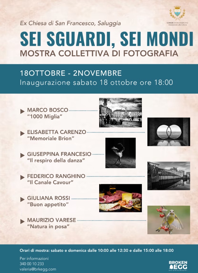 Dal 18 ottobre al 2 novembre, l’ex Chiesa di San Francesco a Saluggia ospita la mostra collettiva “Sei sguardi, sei mondi”, promossa dall’Assessorato alla Cultura del Comune di Saluggia e curata da BrokenEgg. L’inaugurazione è in programma sabato 18 ottobre alle ore 18.